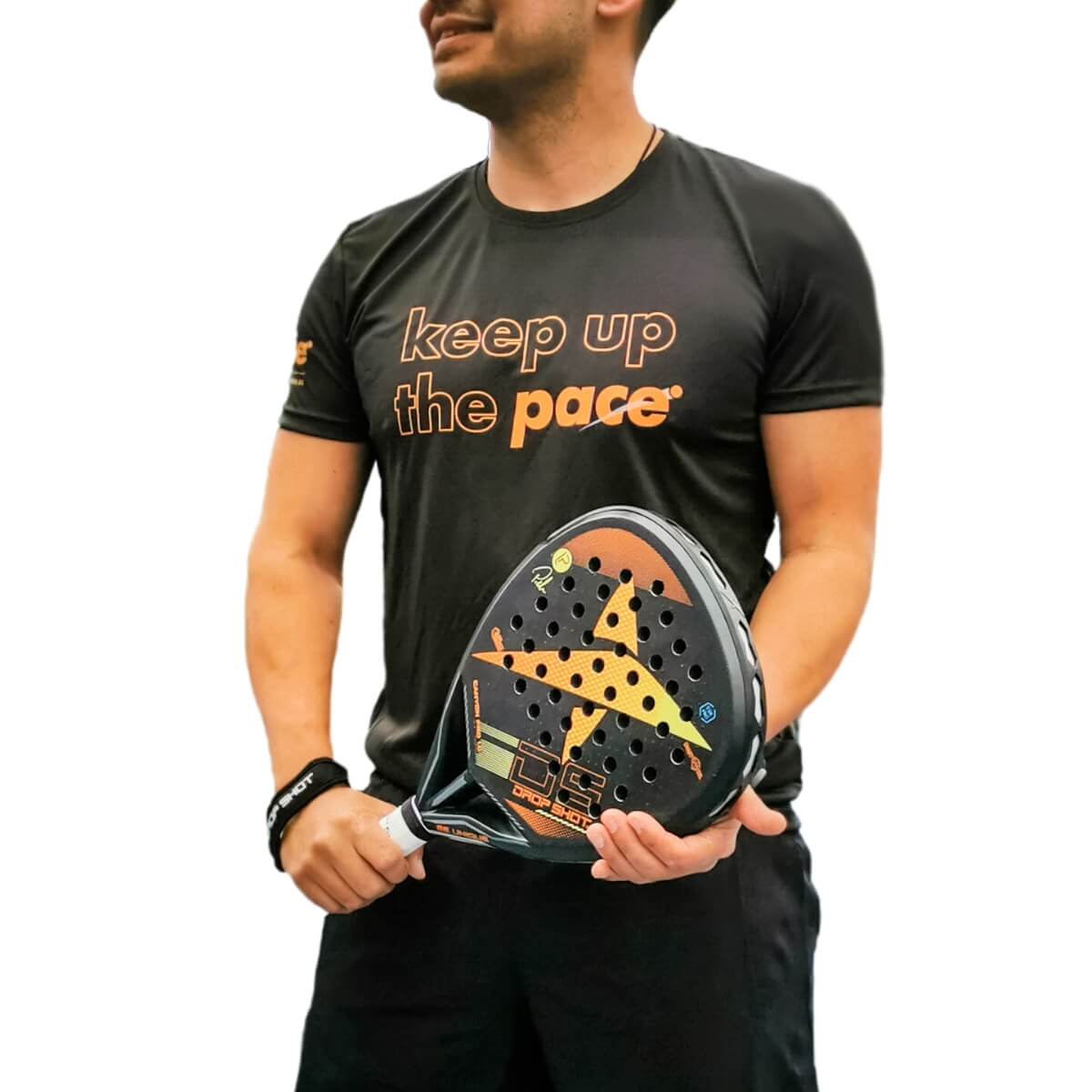 Slim fit men's sports shirt made of fast-drying and breathable technical interlock material, with the logo of Pace and Grand Slam Tienen. On the front is our slogan 'Keep up the pace', on the right sleeve the logo of Pace and on the left sleeve the logo of our partner club Grand Slam Tienen. An ideal sports T-shirt to play padel.